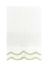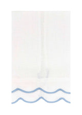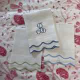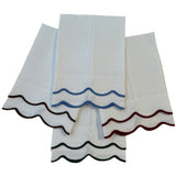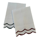 A sophisticated linen guest towel finished with a double scalloped trim border.