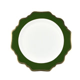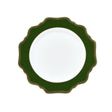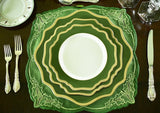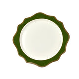 Dimensions: Chargers have a 13" D, Dinner Plates have a 10.5" D, Salad Plates have an 8.5" D, Appetizer/Dessert Plates have a 6.5" D.