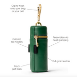 Elevate your game with our leather golf ball and tee carrier. Designed with convenience in mind, it features a zippered enclosure that can accommodate 3 golf balls, a swivel dog snap to attach to your golf bag and 2 elastic bands to hold tees.