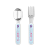 - Fork & Spoon: 5.5" L stainless steel, dishwasher safe