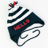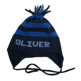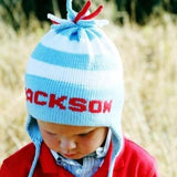 Keep your snow bunny warm and looking adorable in this personalized earflap knit hat. Hand knit in the USA.