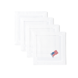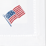 An elegant set of hand embroidered hemstitched cocktail napkins adorned with the American Flag. The perfect housewarming or hostess gift.