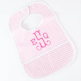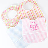 This cotton laminated bib makes clean-up that much easier. With its pocket for crumbs to the wipeable surface this bib is cute and functional.