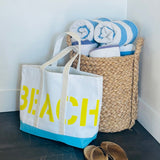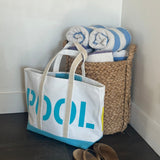 A fun spin on a classic canvas tote for the pool and beach lover. One side is printed with POOL and the other with BEACH.